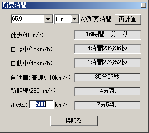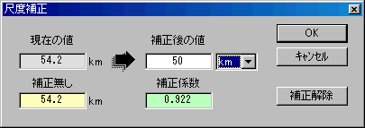 ![]() 地図を画像にした場合、尺度が不正確になることがありますが、補正することで正しく測定することができます。 正確な地図には尺度が記載され、基準の距離が表示されていますので、その距離を測定し、実測値とのズレを「尺度補正」で調整します(下図)。調整後、地図を測定すれば自動で補正された距離を計算します。 ![]() ※オマケとして、測定した距離を様々な移動方法で要する時間も表示します。 ※尺度とフリースケールで測定した距離から計算できる他、手入力で任意の距離を指定して計算させることも可能です。(下図) ![]() |