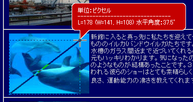 ■2点測定始点と終点をそれぞれクリックします。右クリックすると始点をキャンセルできます。より正確な始点・終点を指示するため、キーボード「↑」「→」「↓」「←」によるマウスカーソルの移動と、「スペース」キーによる左クリック(右クリックは「Shift」+「スペース」)も可能です。 (キーボードショートカット一覧参照) ![]() |