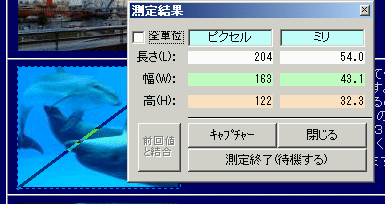 ■キャプチャー測定結果の画面で「キャプチャー」ボタンを押すと、測定範囲の矩形をキャプチャーすることができます。![]() 「保存」はBMP形式での保存。 「起動」はBMPファイルに関連付けられた アプリケーションが起動します。 ※設定で起動アプリを指定可。 |