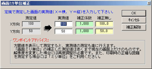 ■画面補正測定結果の画面で「画面補正」ボタンを押すと(「画面ミリ単位」選択時有効)、ディスプレイの実測値とミリ単位の測定値のズレを補正することができます。![]() |