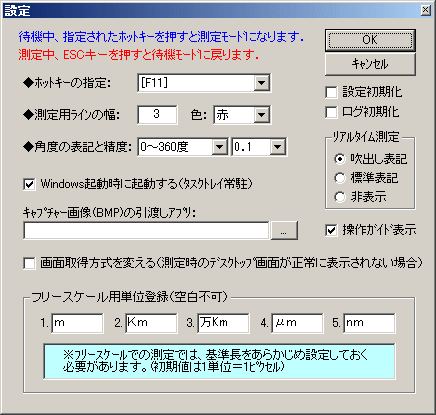 使用方法起動するとタスクトレイに常駐し、待機します。(下図)![]() 注意:動作にはVisualBasic6(sp3以上)のランタイムが必要です。 「なっちゃんずらんたいむ」をご利用ください. アイコンをクリックするか、F11キー(変更可)を押すと、測定モードになります。 このとき右上に ※「ESCキー」で待機モードに戻ります。(キーボードショートカット一覧参照) |