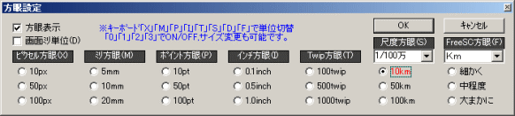 ■方眼線 方眼線を表示させることで目測が可能になります。始点を入力する前に、右クリックして左図のメニューを 表示し、方眼表示を選択します。 ※キーボードショートカットが使えます。(キーボード・ショートカット一覧参照) 「X」=ピクセル単位方眼、「M」=ミリ単位方眼 「P」=ポイント単位方眼、「I」=インチ単位方眼 「T」=Twip単位方眼、「S」=尺度単位方眼 「F」=フリースケール方眼 「D」=画面ミリ単位方眼 「0」=方眼OFF、「1」=細かく、「2」=中程度、「3」=大まか 「設定ダイアログ」 ![]() 「10km方眼線が引かれた図」 ※5目盛り毎に実線が入り目測しやすくなっています。 ![]() ※測定中にも、長さ(L)、幅(W)、高さ(H)、角度 を表示しますので大変便利です。(下図) 連続測定時には、始点からの累計値、3点角度が表示されます。 表示も吹き出しタイプもあります。また非表示にすることもできます。(Ver.0.5.0より) ![]() ![]() ※吹き出しの色は、測定用ライン線の色によって3種類あります。(設定画面参照) |
