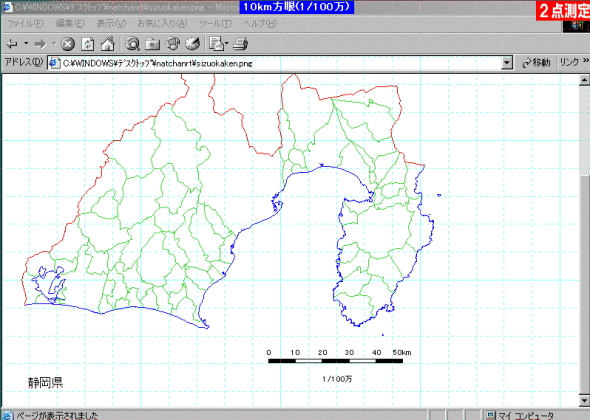 尺度のある地図も正確に測ることができます。下図は1/100万の地図(鎌田輝男さん作のフリーソフト「白地図 KenMap」で作成しました)ですが、尺度リストから「1/100万」を選択(手入力も可)します。 |